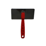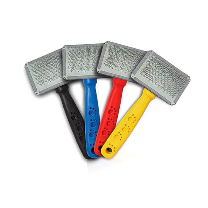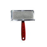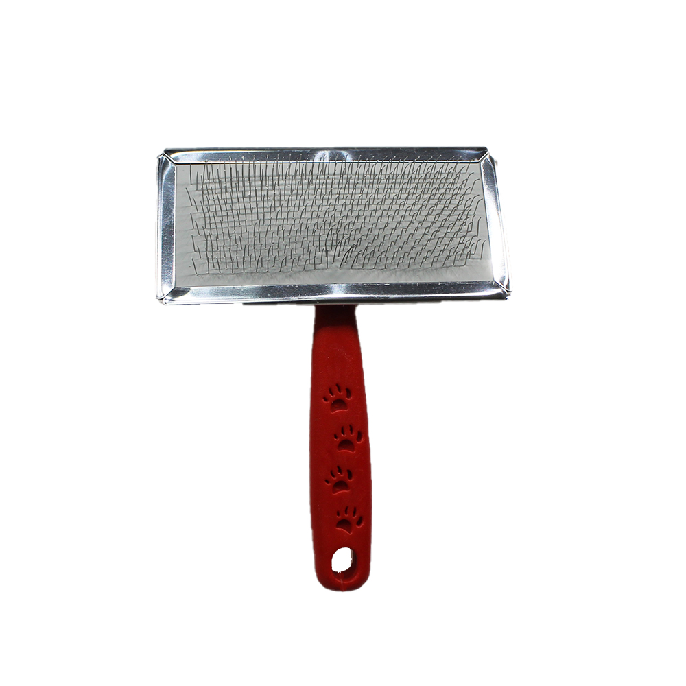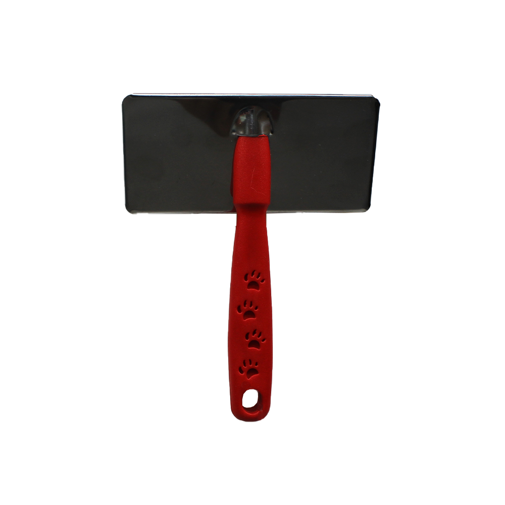 Rasqueadeira Nº2 com cerdas metálicas flexíveis e cabo vermelho decorado com patinhas. Ideal para pets de porte médio a grande.