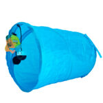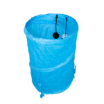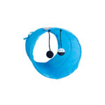 Túnel azul para gatos em poliéster, com brinquedos pendurados. Ideal para brincadeiras e esconderijos. Dobrável e fácil de guardar!